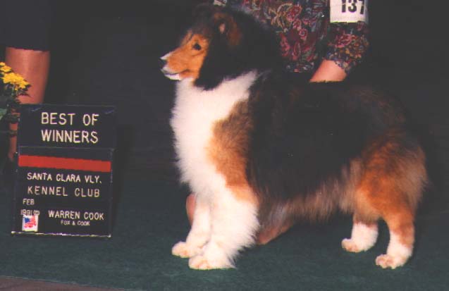 "Loni Anderson" was without a doubt, the most beautiful sheltie bitch, we have ever bred. With a gorgeous eye and expression and exceptional neck and outline...She had it ALL. Being a full sister to "Ryan O'Neil" and "Tatum O'Neil", "Loni" was, like them, very prepotent for her own look. She became an exceptional producer. For us "Loni" bred to "Ryan O'Neil" produced "Alfenloch Peforming Arts", who was the dam of 1993 A.S.S.A. Winners Bitch, "Ch. Glen Corry's Bronwyn Bobby Sox". "Loni" was purchased at age two by Classy Shelties and became a valuable foundation bitch for them. "Loni" is the grand dam of "Am/Can. Ch. Classy's Wall Street" and the dam of two exceptional bitches "Ch. Classy's Beauty Cream" and "Ch.Classy's Seeking The Gold" For those who appreciate TRUE sheltie beauty, "Loni Anderson" will always be remembered.
